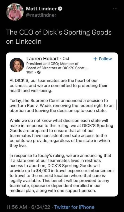 Are they also going to spend $4,000 for their employees to have a live birth, or is abortion the only action they choose to reward?I do expect there will be more corporate titans who decide to do the right thing for their employees like Dick's is doing.