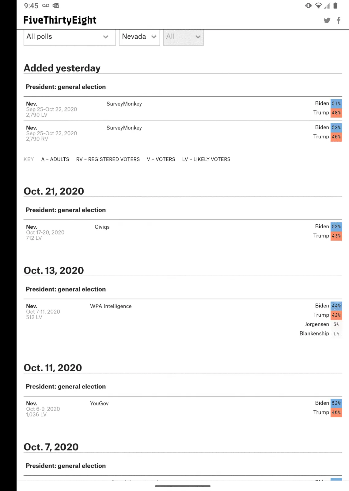 The poll. You asking only ten people is not statistically significant enough to imply a city wide trend.how come you didnt answer this question gt?.....here instead of dancing give it a shot now....My problem is that somebody told you that your little story about talking to people is less indicative of a trend than polling.and yet like the other party people you cant prove shit about what you said about me....and if i want daddy trump how come i am on record here saying that he is a big mouth asswipe who doesnt know when to ******* shut up.....your problem gt is obvious....you are a ******* party asshole and if someone is not in your little club, you cant stand it and start with your typical party bullshit rant.....Someone told you a scientific poll is more trustable than who you talk to.were did i say it was superior?......or did i say thats what is being said to me?....what the **** is wrong with you?....or is it because you are one of those party assholes that just cant understand how someone does not think along your lines?...Your first sentence said you didn't say something that your next sentences literally just said.no i did not say my anecdotes were superior....all i said was what was being said to me....your the asswipe who is adding words to this conversation...unlike you gt i dont put a lot of credence in polls...the polls said hillary was going to bury trump.....if polls say 9 out of 10 people in vegas want to lock down and i have 10 people in front of me and 9 of them say they dont want to lock down....who should i believe the poll or what i just experienced?...I don't need their opinion on shutting down to have their opinion on the general election. They've been polled on the general election.if it wasnt me who was it?....why dont you show me some superior data saying how the people who live in vegas want to shut down....especially the thousands who work in the casinos....This wasn't you, ^^ harry?oh really....so believe some stupid poll when in the real world it dont seem that way...gotcha.....hey just telling you what the peoples attitude is.....i thought they would be pretty anti trump....i dont see it.....lots out here dont like gov. Sisolak thats one thing i hear....i live here and when i am out i dont hear hardly anyone talking bad about trump...and yes the conversation is usually about being locked down and masks....people i run into want to get back to work...now....Did Biden lose Nevada?