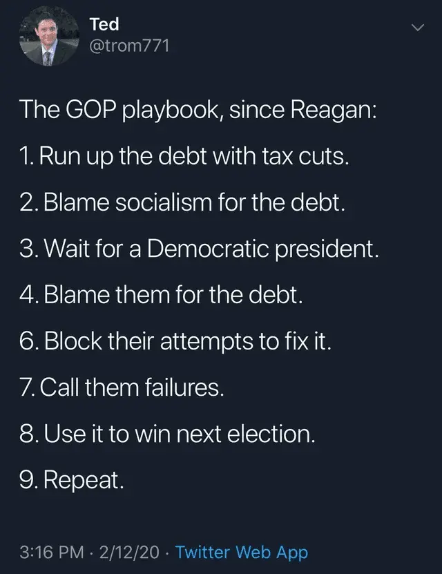 Debt is only bad when those who benefit from the policies are people you feel don't deserve to benefit...which is usually poor people, people of color...anyone outside of your circle jerk of fascist sycophants