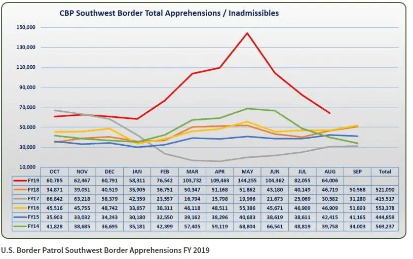 The U.S. still posted the worst overall year in more than a decade, with more than 850,000 illegal immigrants nabbed entering the country without authorization in fiscal year 2019, which ended Sept. 30.