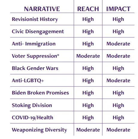 1. The three most significant narrative threats to Black voter engagement in 2024 are misleading narratives about: Civic Disengagement, Biden Broken Promises, and Stoking Division.