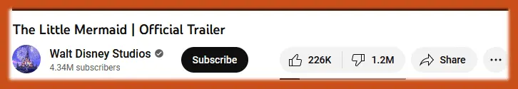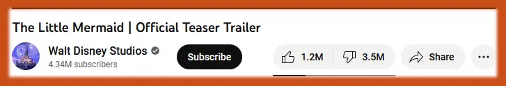The Little Mermaid trailer has accumulated 1.1 million “dislikes” on YouTube as of Friday afternoon, while the number of “likes” stands at just 196,000, according to a Google Chrome extension that unblocks the “dislikes” counter."