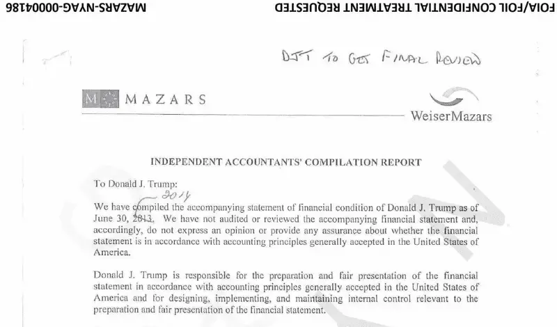 McConney was handed People's Exhibit 3054, a draft of Trump's net-worth statement for 2014. He was asked to look at his own scribbled note, "DJT TO GET FINAL REVIEW," which he'd written in thin blue ink on the draft's first page.