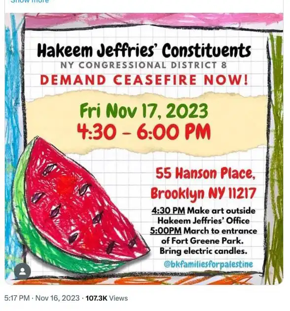 “The watermelon has long been deployed as a dehumanizing racist trope by white supremacists in America. In connection with the planned rally targeting our district office, the use of racially inflammatory imagery should come as no surprise given the role NYC-DSA and other gentrifiers have played in aggressively attacking black elected officials,” Andy Eicher, Jeffries’ communications director, told The Post in a statemen;