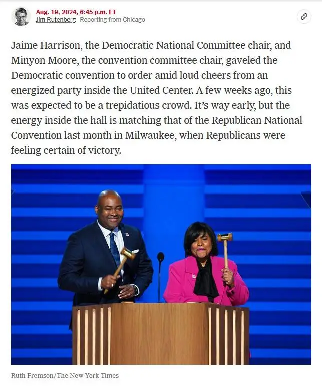 Jaime Harrison, the Democratic National Committee chair, and Minyon Moore, the convention committee chair, gaveled the Democratic convention to order amid loud cheers from an energized party inside the United Center. A few weeks ago, this was expected to be a trepidatious crowd. It’s way early, but the energy inside the hall is matching that of the Republican National Convention last month in Milwaukee, when Republicans were feeling certain of victory.