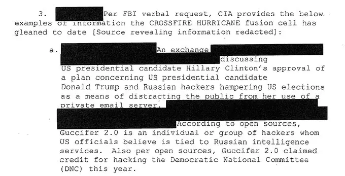 “We’re getting additional insight into Russian activities from [REDACTED],” Brennan notes read. “CITE [summarizing] alleged approved by Hillary Clinton a proposal from one of her foreign policy advisers to vilify Donald Trump by stirring up a scandal claiming interference by the Russian security service,” Brennan’s notes read.