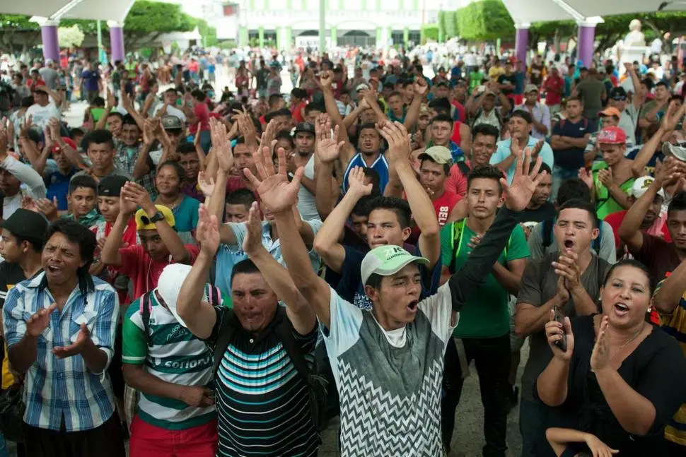 A group of Central American migrants gather in the central park of Ciudad Hidlago, Mexico, Saturday, Oct. 20, 2018. Mexican authorities for a second straight day refused mass entry to a caravan of Central American migrants held up at the border with Guatemala, but began accepting small groups for asylum processing and gave out some 45-day visitor permits that would theoretically allow recipients time to reach the United States. (AP Photo/Oliver de Ros) THE ASSOCIATED PRESS