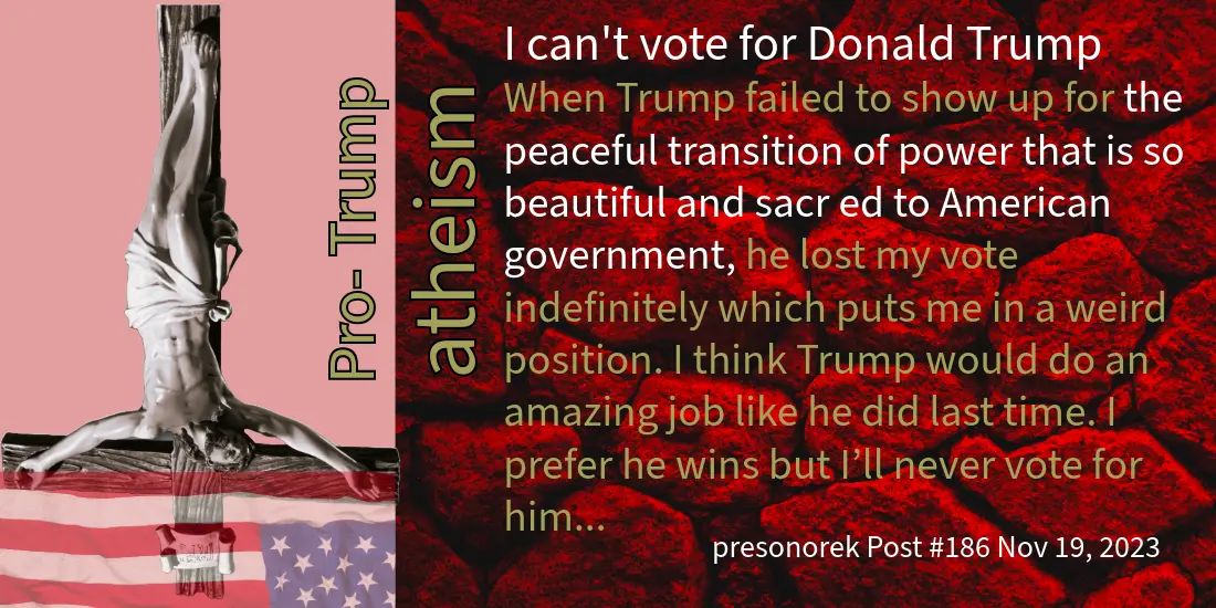 I like what you said about the peaceful transfer of power being sacred and beautiful. As a rational theist, I am supportive of your right to be an atheist and the most sacred and beautiful piece of the United States Constitution. The first amendment.I feel that if I give you a thoughtful response then you will not respond to me. I feel that if you and I swap insult for insult then we can carry on a conversation for years. I'm interested in neither. Say your piece and move on. I cannot decipher your motives and I have decided not to try.