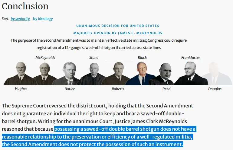 Lewis v. United States (1980); Footnote 8 (the Second Amendment guarantees no right to keep and bear a firearm that does not have "some reasonable relationship to the preservation or efficiency of a well regulated militia");
