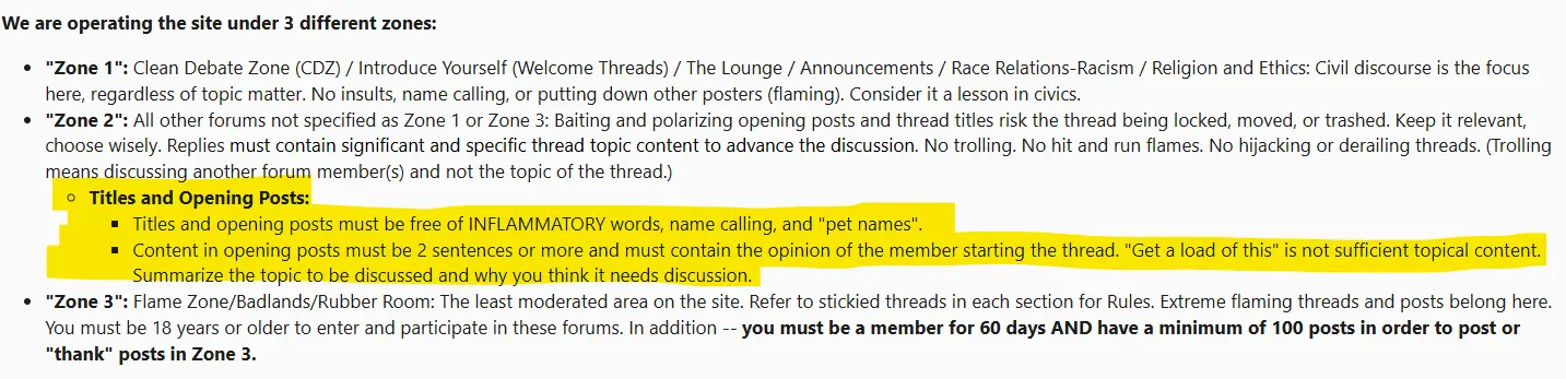 I've been active on this site for 18 years and I know what Zone 1 is because it is labeled. But I've never known what is in Zone 2.Yes! Opening posts in Zones 1 and 2 must abide by the Clean Start Rules.