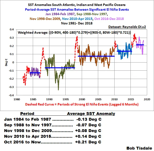 There is a very simple explanation for those El Niño-caused upward shifts that also make themselves known in the sea surface temperature data for much larger portion of the global oceans than I first presented a decade ago…the upward steps that are blatantly obvious in the satellite-era (starts November 1981) of sea surface temperature data for the South Atlantic, Indian and West Pacific Oceans, as shown in Figure 1, which together cover about 52% of the surfaces of the global oceans.