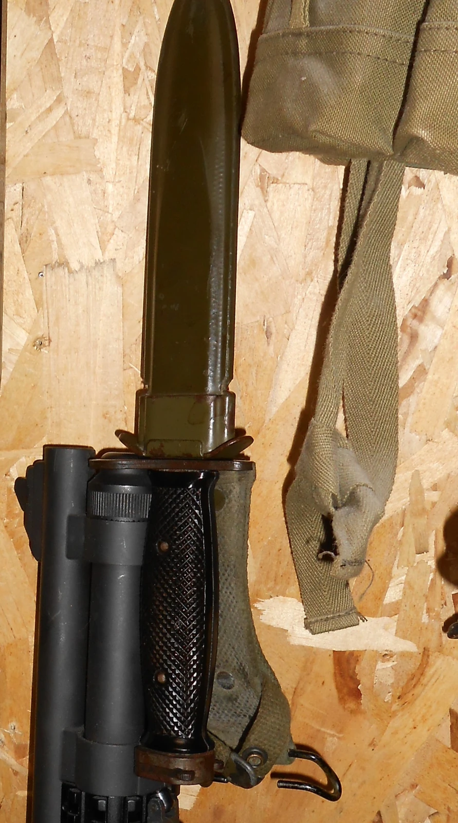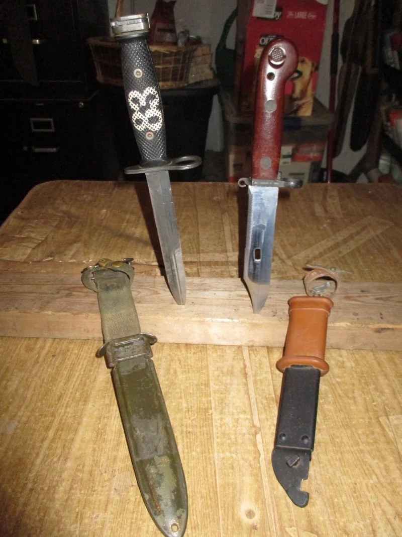 The one on the left is a Vietnam War era US M7 that I found at a flea market the other day for $30. Most bayonets have a dull factory edge, as required by the Geneva Convention, although this one has a razor-sharp edge...