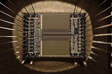EPROM memory microchip showing the memory blocks, the supporting circuitry and the fine silver wires which connect the integrated circuit die to the legs of the packaging.