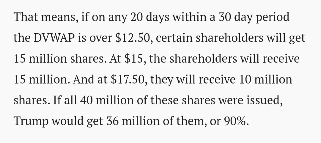 Donald Trump negotiated a 36 million share bonus if DJT stock stayed above $17.50 a share for 20 days out of any 30 day period.