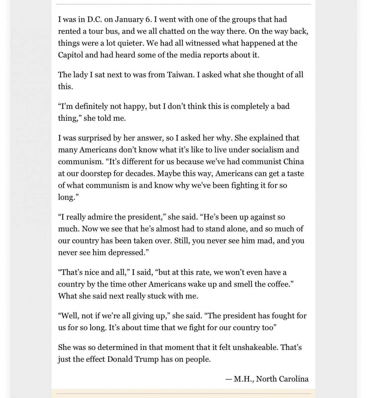 Trump talked only about the election being stolen from him and marching to the Capitol to fight like hell for their country; and none of his terrorists there that day said anything about the riots. They did chant for the death of the vice-president. Them's your peeps.