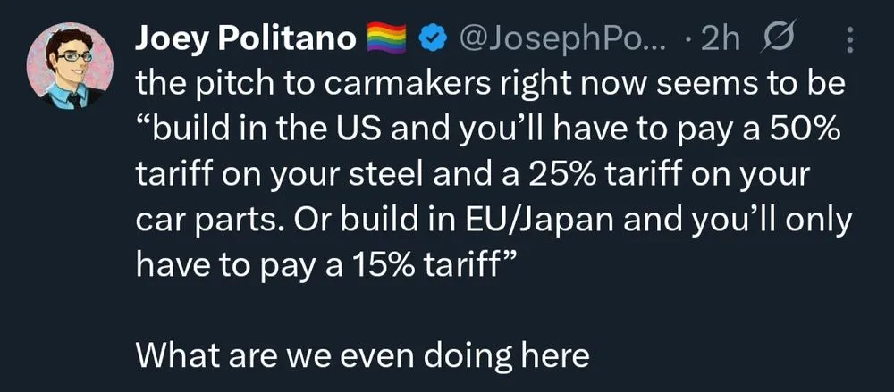 Trump ison track to collect 300 billion in tariffs this year. Thats over a trillion in 4 years and along with the spending cuts and increase in GDP the deficit can be wiped out and Americans can get a rebate. Why couldnt Biden do thatSo far its not happening the economy is thriving and its just 6 months