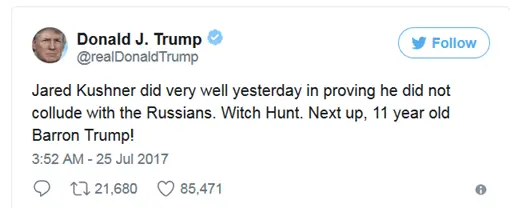 This is the not the same thing as having your kid stand next to you while you give a speech- this putting Trump putting his own kid's name out there in the political arena to whine about how Trump believes he is being unfairly treated.