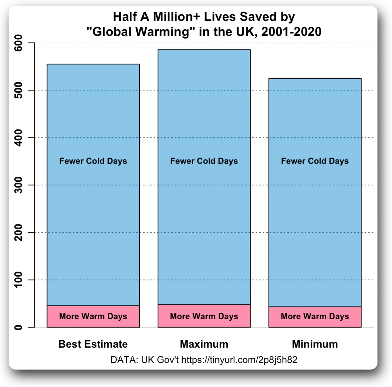 And here’s the UK Government’s assessment of the effect of more warmer days and fewer cold days … in twenty years, the warming has saved over half a million lives.