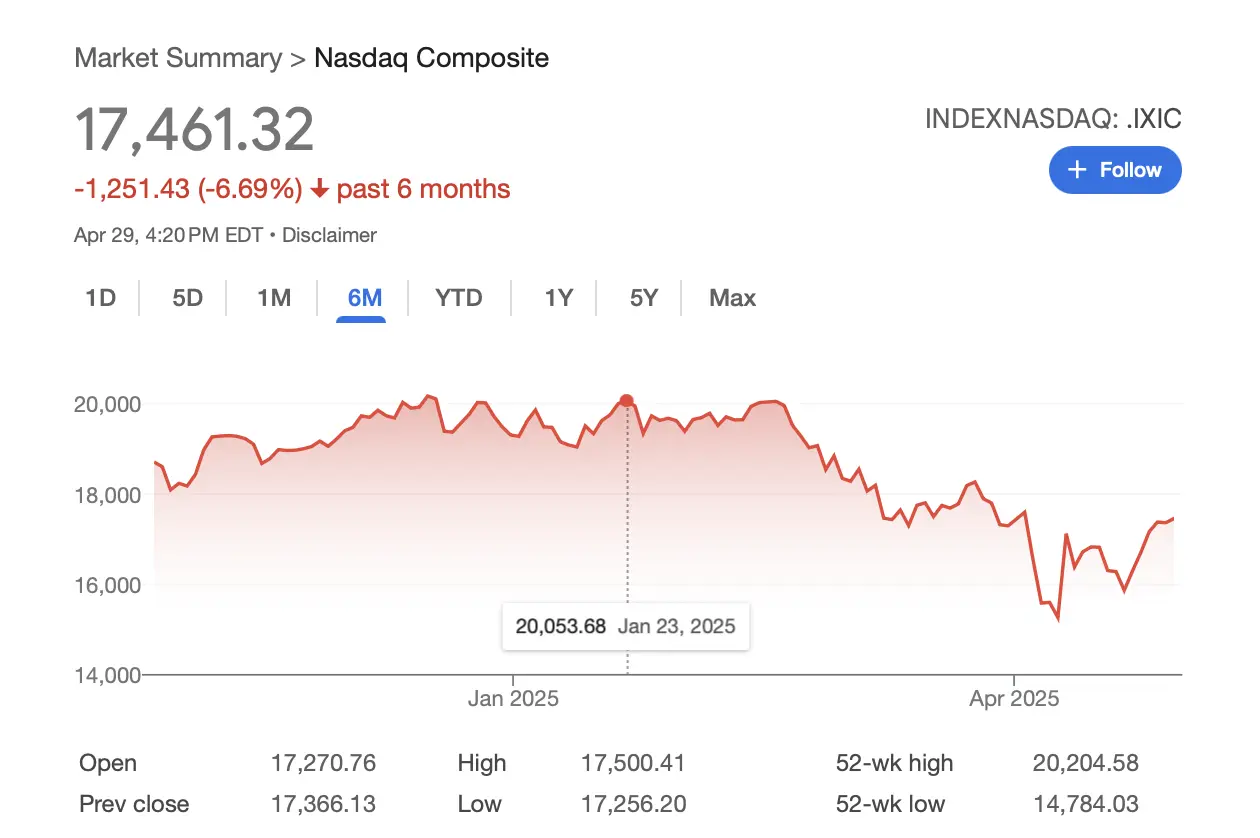 How about -23.86 % for the NASDAQ between 1/23/25 and 4/8/25