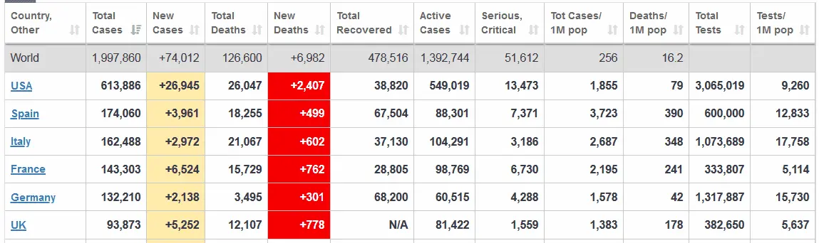 1. The highest "rate" of infection and death in the world is NOT the US, its Spain, see chart on my Post #60. (Rate means per unit, in this case of population)