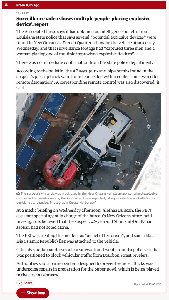 Suspect identified after driver kills ten, injures dozens in Bourbon Street truck attack