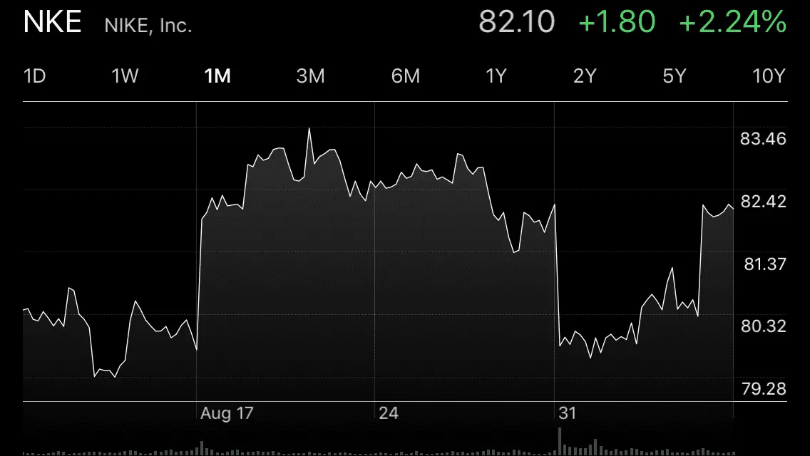 No, but the graph you show tells the same story. Stock goes down when the signing is announced, stays down for about a week and comes back up. Your graph misses today when it came back up some more. Nike stock was only affected for a week.You mean this graph that shows they are still down because of their divisive politics?All I did was Google Nike stock. Gave immediate access to graphs. Well, I had to click the one year graph because the day prices (hourly graph) came up first.I'm guessing this this is going to require you to find the goalposts after he responds.Nike stock went down a couple of dollars when they signed him. Their stock prices had risen rather dramatically over rhe last year. about $20 per share from $58 to about $80 and now $83. A small dip since rhe signing a week ago has been recovered and is now shooting up and rising.Well their stock is up as well. I posted a picture of it in the thread. Next requirement?