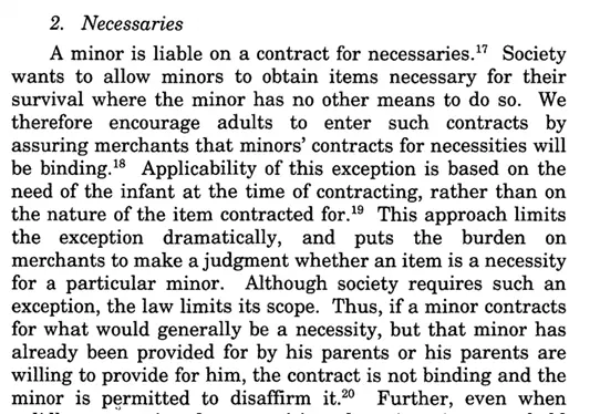 Remember- what this means is that a minor is on the hook for necessaries - within the contract- if they are not supplied by their parents. Meaning the minor would be liable to pay for such necessaries.