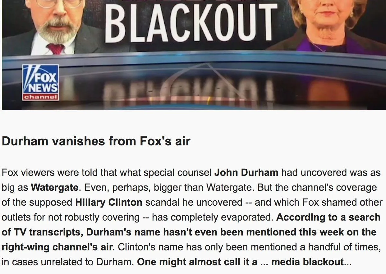 Like.....why is Fox News doing a media blackout on the Durham report?? Wasn't it supposed to be bigger than Watergate??