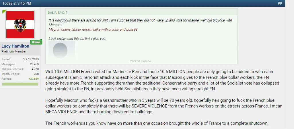 You tolerated the files S those who want to kill the French because it is of actuality at the moment !The french people have done well to turn away from a neo nazi who would increase division. Why are vichy trash like her still tolerated ?So you are hoping for more terrorist attacks in order to further your political agenda ?It is ridiculious there are asking for shit, i am surprise that they did not wake up and vote for Marine, well big big joke with Macron !