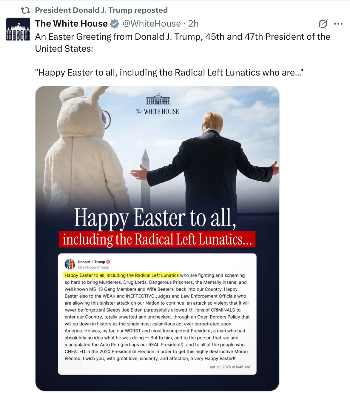 Trump is a dangerous, evil man. His supporters love him because he hates the same people they do.Sorry to have to say this now - but this anti-Christian man is a shame for all mankind. How can someone take serios what this cursing absurd man said at Easter?