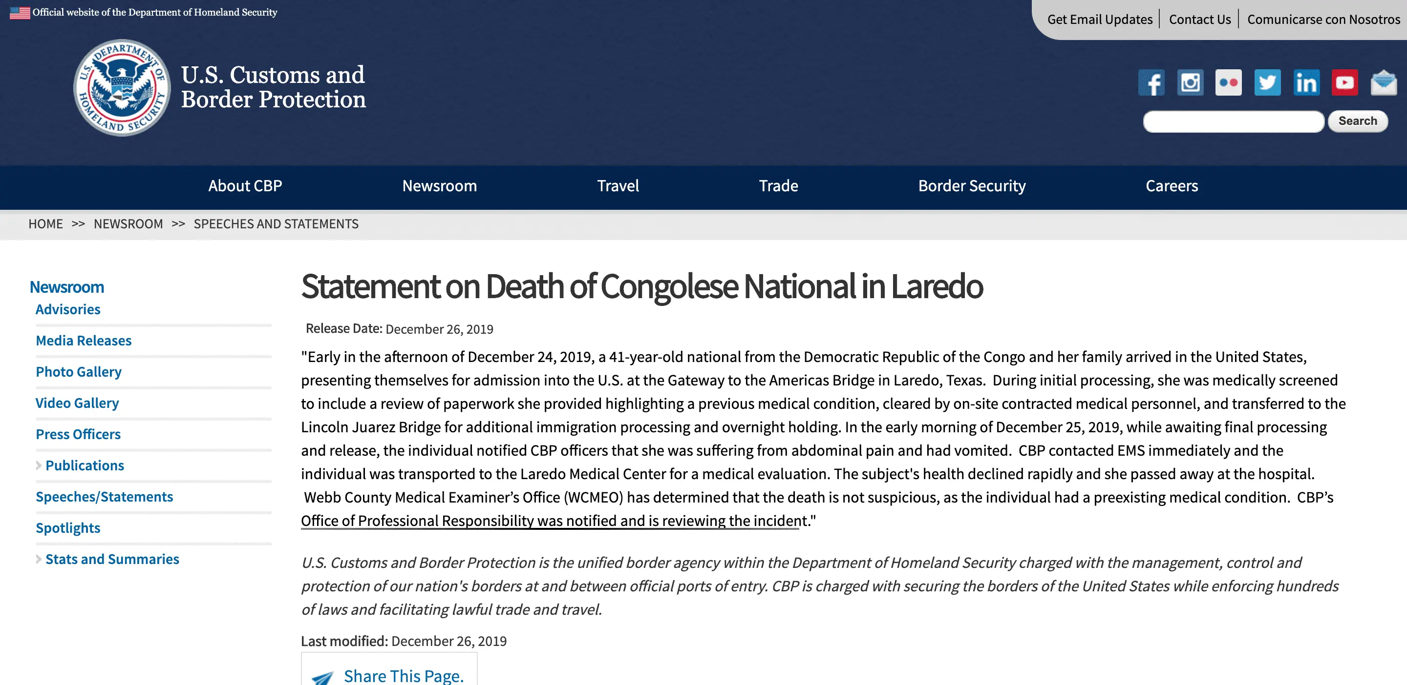 Statement on Death of Congolese National in Laredo | U.S. Customs and Border Protection