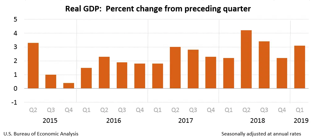 Real gross domestic product (GDP) increased at an annual rate of 3.1 percent in the first quarter of 2019 (table 1), according to the "third" estimate released by the Bureau of Economic Analysis. In the fourth quarter of 2018, real GDP increased 2.2 percent.