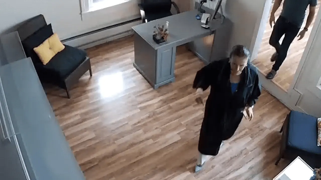ALARM no mask!!!!!!!! She's shitting her pants after being caught red handed in do as I say not as I do it's hilarious.