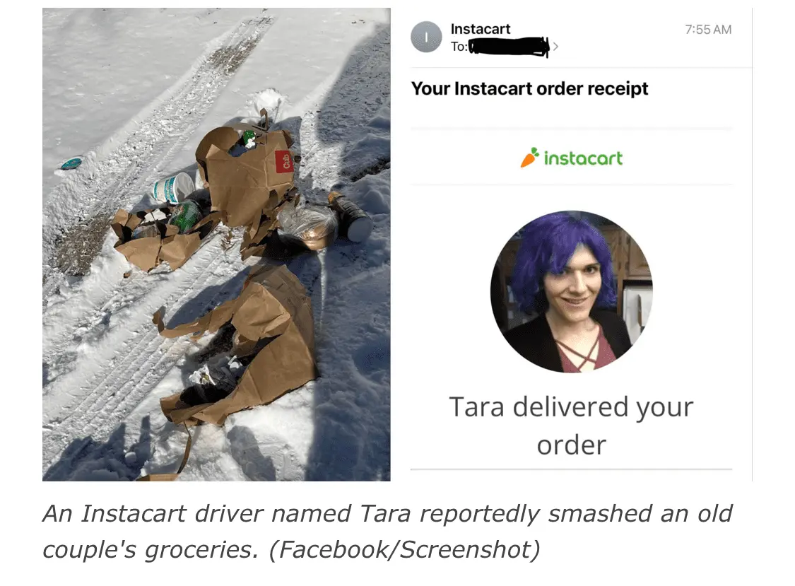 A driver for the grocery delivery service Instacart smashed an elderly couple's groceries and left a nasty note on their receipt because of their yard sign supporting the local police department.