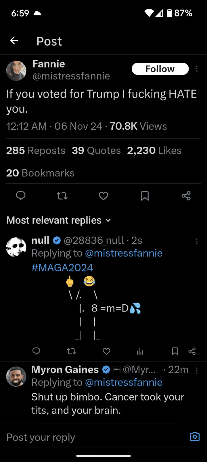 Imagine how heavily propagandized you have to be to literally off yourself of sterilize yourself over an election outcome hahahahahaIf someone just described these reactions instead of me seeing them- I'd think they were lying or at least exaggerating.