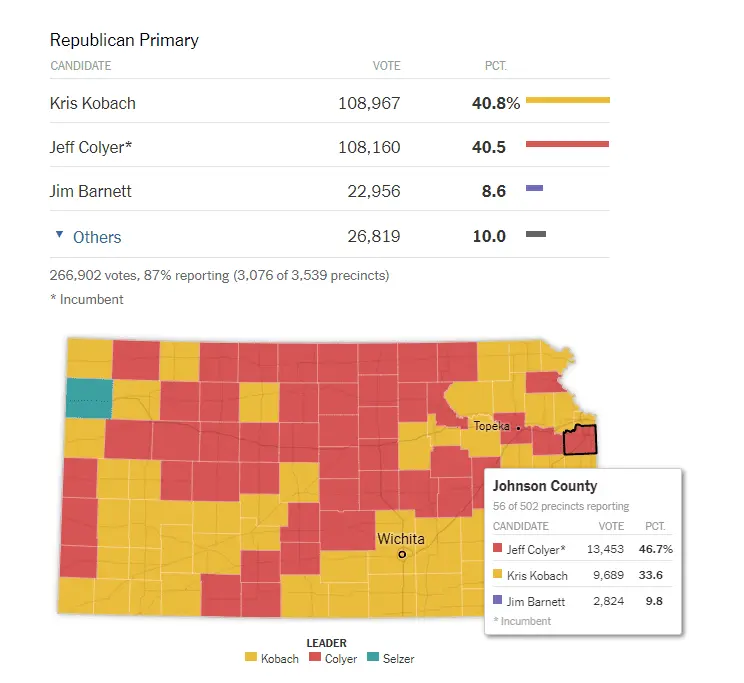 This is the current situation with 87% of the vote counted, before I made an error and had not noticed that the below Johnson County had not finished counting, they are very slow and have only completed 11% of their count of 56 out of 502 precincts, Morris County that I mentioned before have now completed 100% of their vote count and that result is Jeff Colyer 370 votes 40.7%, Kris Kobach 318 votes 35.0% and Jim Barnett 120 votes 13.2%.