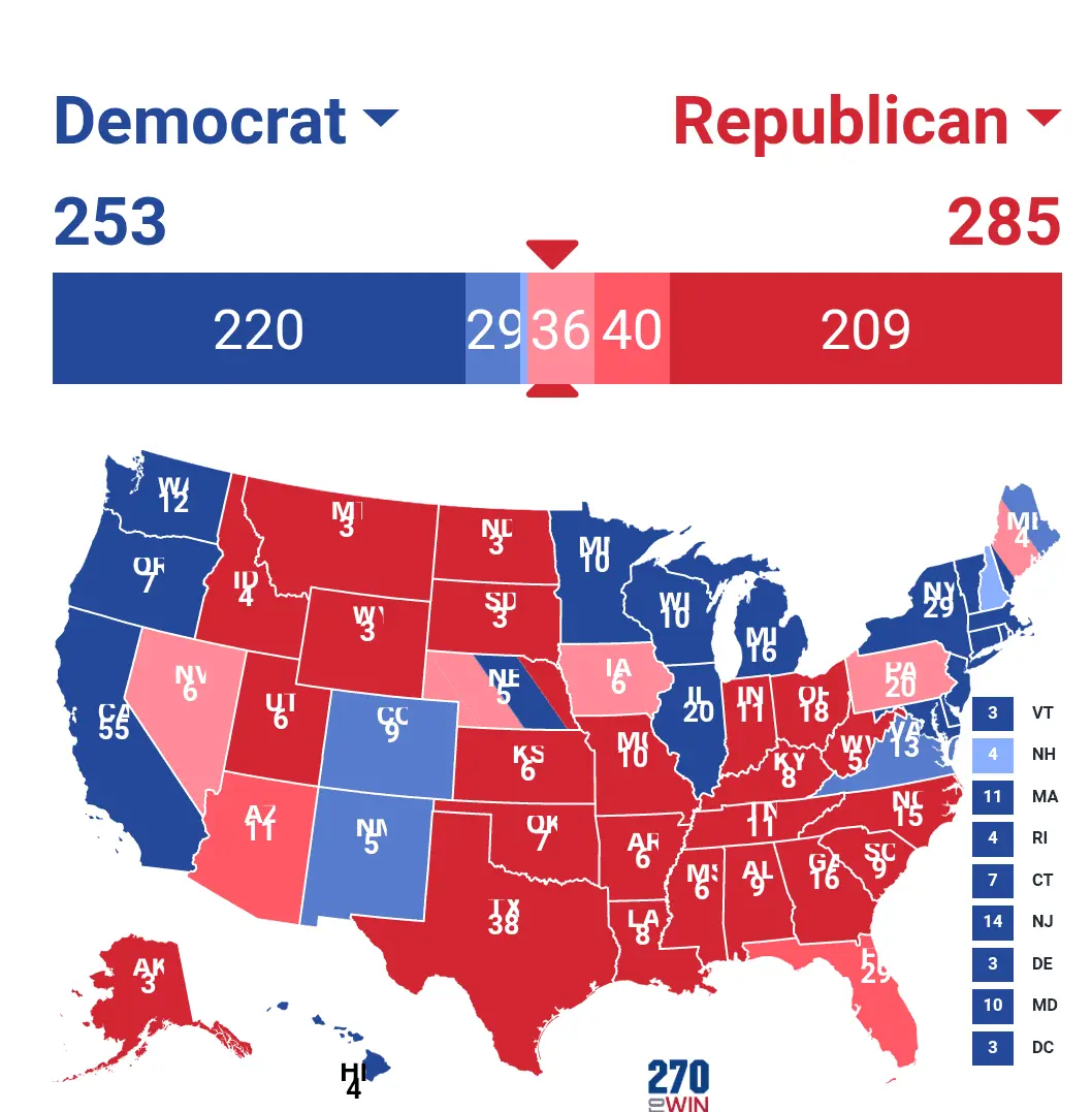 That leaves us with the following states in play - WI, MI, PA, NC, AZ, FL, TX, IA, OH, and GA. We can also put in there ME2 and NE2