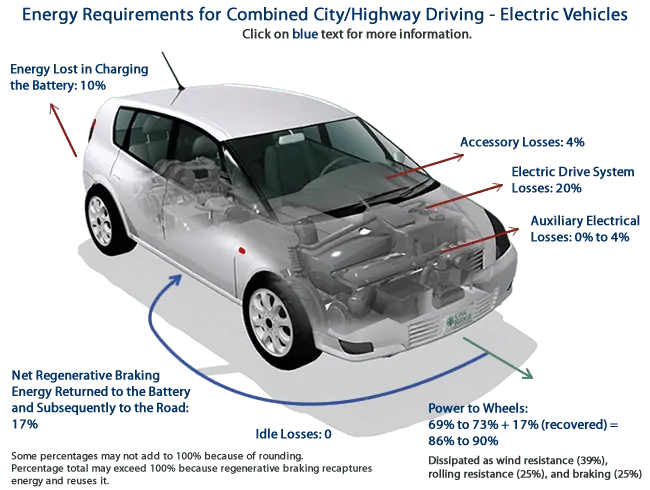 EVs are 60% to 73% efficient, depending upon drive cycle (77% to 100% efficient if the energy recaptured from regenerative braking is counted).www.fueleconomy.gov