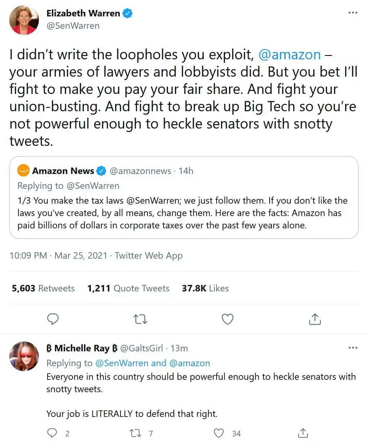 Threatens to break up Amazon so they can’t heckle the DC elite. (And they did a fantastic comeback)