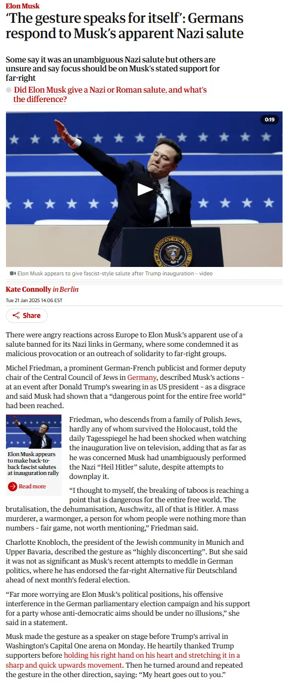 Friedman, who descends from a family of Polish Jews, hardly any of whom survived the Holocaust, told the daily Tagesspiegel he had been shocked when watching the inauguration live on television, adding that as far as he was concerned Musk had unambiguously performed the Nazi “Heil Hitler” salute, despite attempts to downplay it.