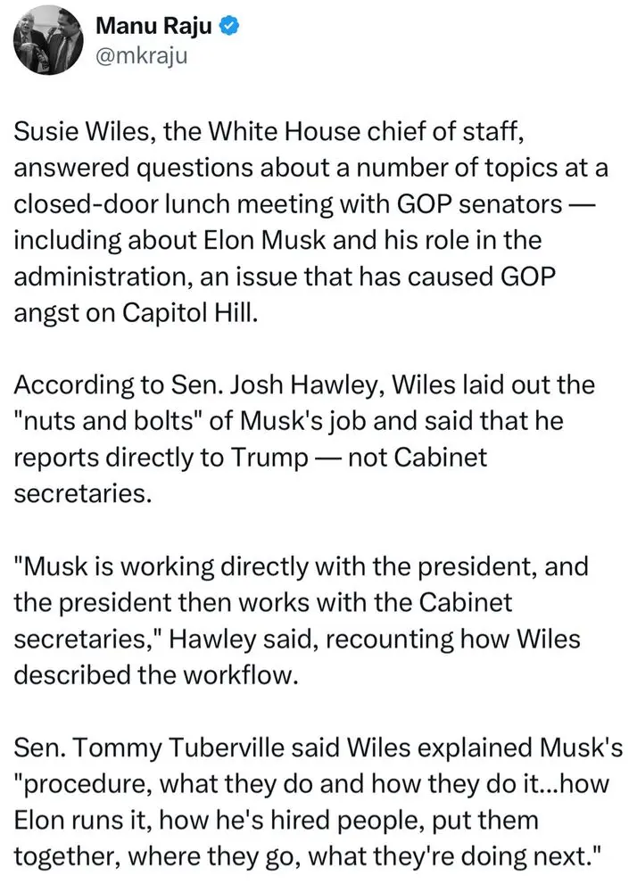Sounds like musk is PRESIDENT.“How Elon runs it, how he’s hired people.”