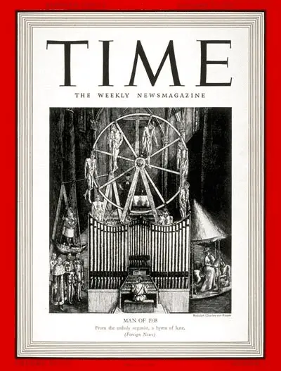 On Hitler’s “Man of the year” cover he was depicted as a tiny figure with his back to the viewer, playing a massive organ with his murdered victims spinning on a St. Catherine’s wheel.