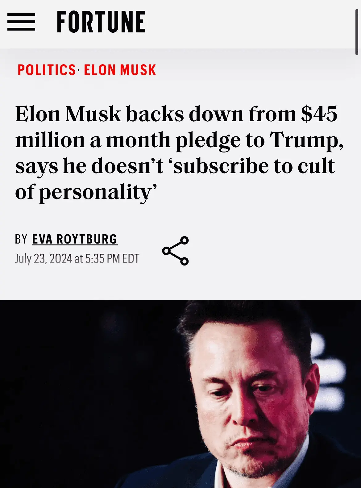 The article I have no reason to question. As for the 462 year thing, I think that was just some Reddit user calculating how, with Musk's wealth, he could do give Trump $45 million a month for 462 years.
