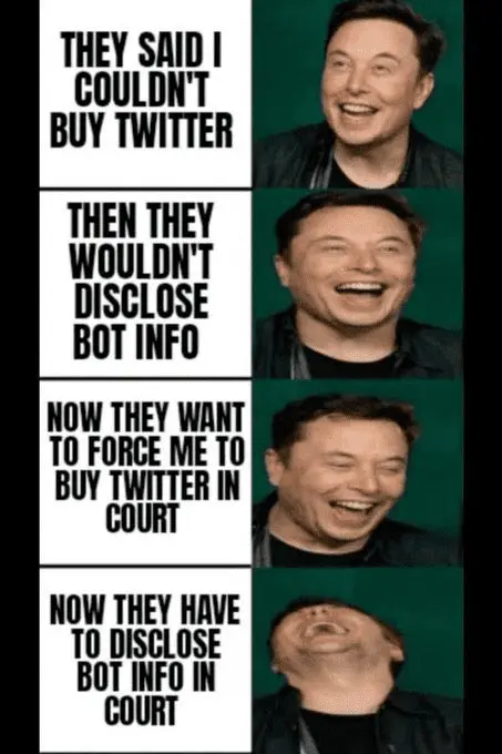 I would still like him to buy it, but how far have we come in a couple months.…from Twitter turning down his offer to Twitter suing to be bought!