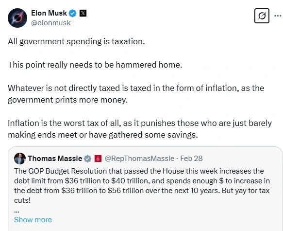 Elon Musk has raised concerns over a Republican-backed budget resolution supported by President Donald Trump, warning that the legislation could significantly worsen inflation and drive the U.S. economy toward bankruptcy.Musk, in a repost reply to a post by Representative Thomas Massie, the only GOP member of Congress to vote down the resolution, alleged the reported spending in the resolution would continue to drive inflation.