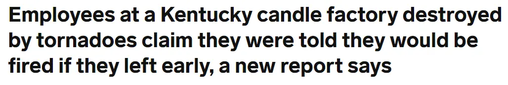 Employees at a Kentucky candle factory that was destroyed by this weekend’s devastating tornadoes said supervisors told workers they would be fired if they left their shifts early to seek shelter from the impending storms.