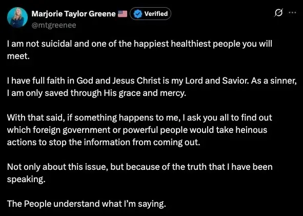 Well, she has been a sensational headline seeker since day 1 but i will giver her some credit for being laser focused on releasing the Epstein files. She has broken with party leaders over it. I suspect she, or someone she knows, was a victim of a similar abuser and she feels like it is her mission to expose whatever she can, in between crazy ass rants about space lasers and such.