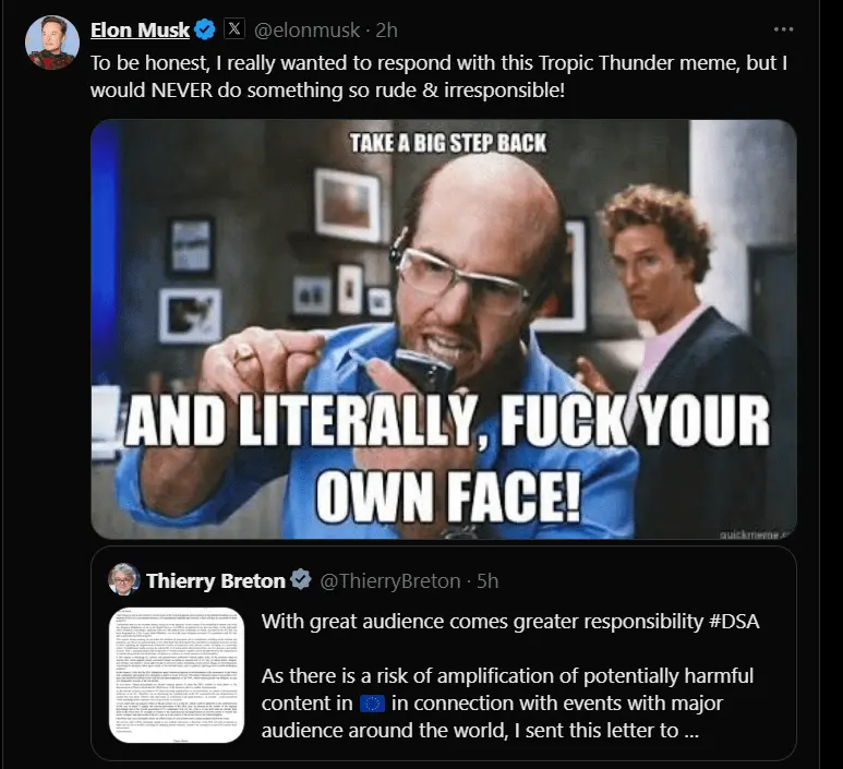You would think with Elon providing internet free of charge for Ukraine in their time of need that these pompous, self hating Europeans would show a little bit more gratitude. Especially as they are going after an American and America saved their lives AND their free speech.