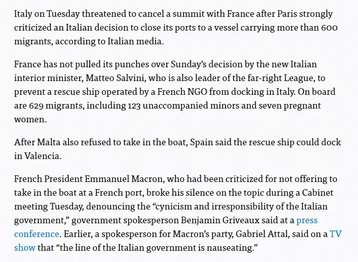 Those Leftist Traitor Mayors in Palermo and Naples that said they would accept the Aquarius defying the new Italian Government, typical Leftsts low IQ Muppets, ALL Italian Ports belong to the State ie. the Government, also NO boat can dock at ANY Port without the assistance of the Italian Coast Guard which is under the administration of the Ministry of Infrastructure and Transportation of the Italian Government. .