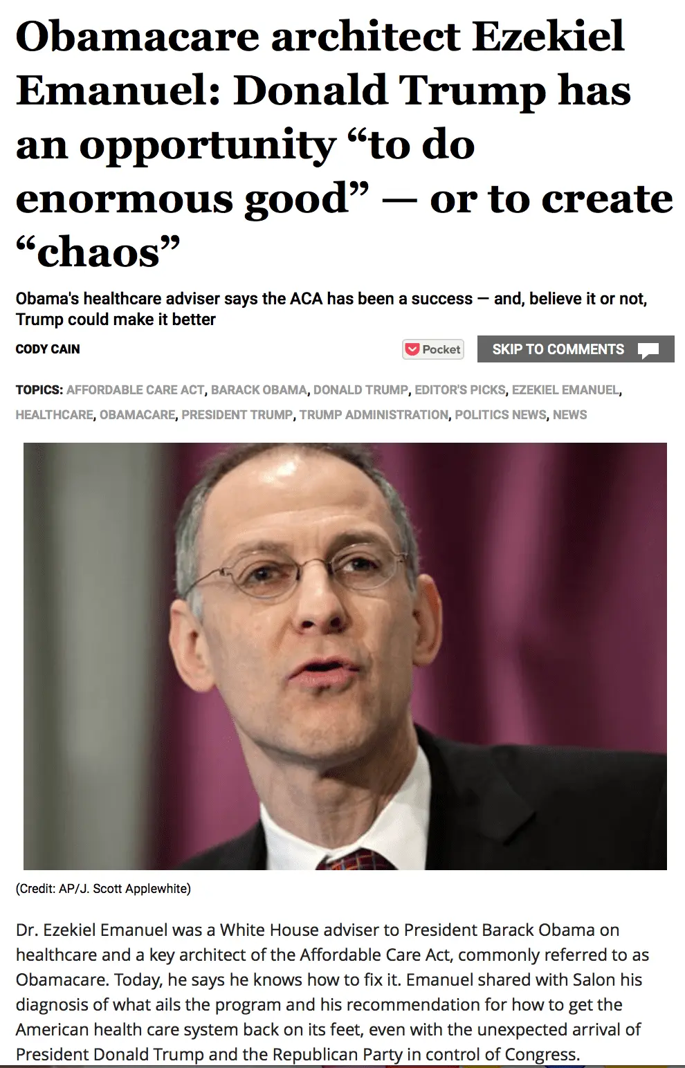 Read below! Obamacare architect Ezekiel Emanuel: Donald Trump has an opportunity “to do enormous good” — or to create “chaos”